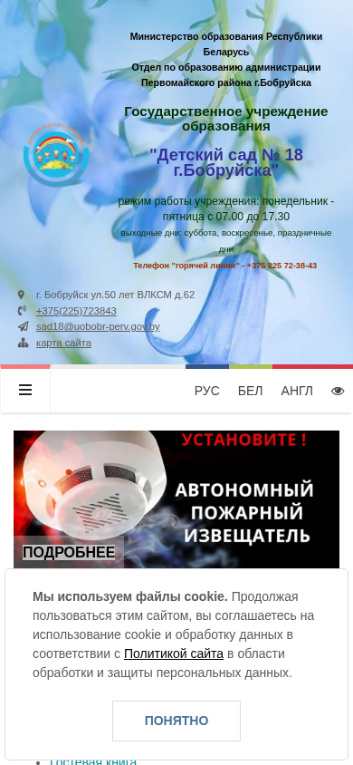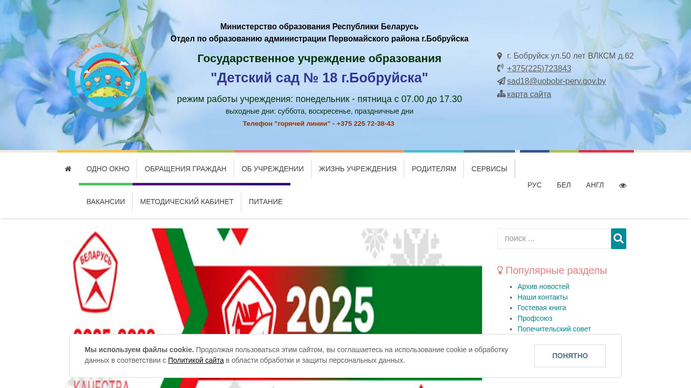 | AI-анализ | The web project "Детский сад № 18 г.Бобруйска" is a government educational institution based in Bobruisk, Belarus, under the Ministry of Education. The institution's name is "Детский сад № 18 г.Бобруйска" and it falls under the administration of the First May District in Bobruysk. The website provides information on the institution's working hours, which are from Monday to Friday, 07.00 to 17.30, with weekends and holidays being the exception. The site also includes a phone number for a "hotline" at +375 225 72-38-43, as well as a physical address at ул.50 лет ВЛКСМ д.62 in Bobruysk. The site features a "One Window" |