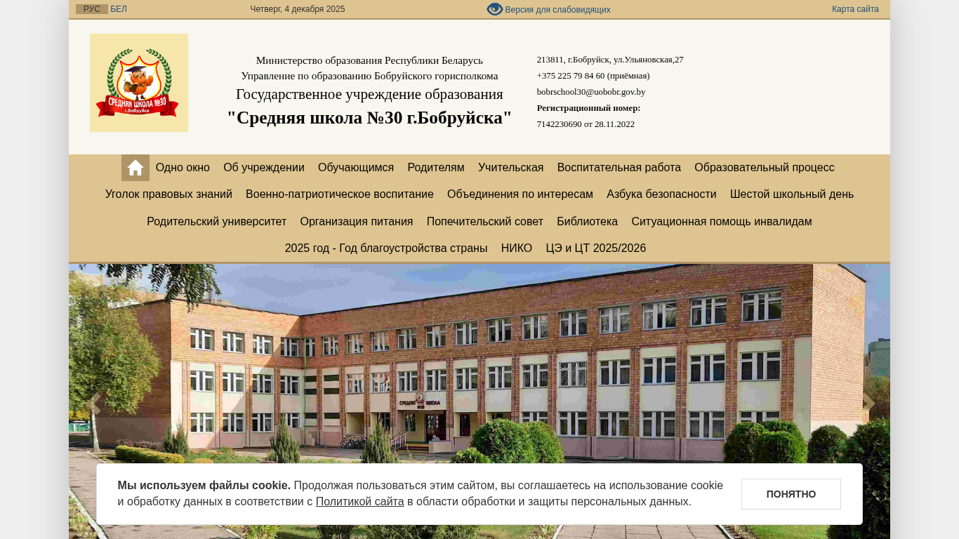 | AI-анализ | This website is for the Middle School Number 30 in Bobruisk, Belarus. The title is 'Средняя школа № 30 г. Бобруйска' and the description includes keywords related to the school, its size, location, and contact information. The top words include the years '2025' and '2026', the word 'read', and various words related to the school's schedule, activities, rules, and safety. The website has a standard size, medium color scheme, and standard font settings. Images are turned off and the color scheme is black and white. The website includes information on the Ministry of Education in Belarus, the Bobruisk city education department, the school's administrative and pedagogical staff, and various educational resources and policies. The school's address, phone number, and email address are provided for contact. The website |