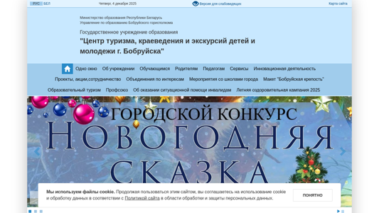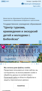 | AI-анализ | The portal 'Centre for Tourism, Local History and Excursions for Children and Youth of Bobruisk' is an educational organization in Belarus providing tourism, local history, and excursion services for children and youth. The website's title and keywords reflect its focus on tourism, education, and youth. Key topics include news, calendars, administrative procedures, and contact information. The site's design is standard, with a medium-sized font, and it includes images in color. The main sections of the site include information on the organization's administration, services, history, and contacts. Additional features include a map of the site and various projects and initiatives. The site is operated by the Ministry of Education of the Republic of Belarus and the Bobruisk City Education Administration. It offers paid services and important documents, and includes a news archive, a guestbook, and search functionality. The site |
