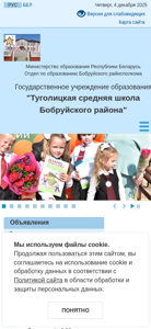 | AI-анализ | The web project "Туголицкая средняя школа Бобруйского района" (tugolica.bobruisk.edu.by) is a website for a middle school in the Bobruisk region of Belarus. The title of the website is "ГУО 'Туголицкая средняя школа Бобруйского района'" (State Educational Institution 'Tugolitskaya Middle School of Bobruisk Region'). The description section contains information about the use of cookies and the policy regarding the processing and protection of personal data. The top_words list includes words related to safety, the year 2025, education, institutions, reading, and the Bobruisk region. The website contains information about the structure, goals, and leadership of the school, as well as policies on personal data and special education. Additionally, there |