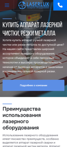 | AI-анализ | The web project "Laserlux.by" is an e-commerce platform selling laser equipment for affordable prices. The site offers for purchase laser cleaning and cutting appliances in Homel and Minsk with delivery. Laser equipment for metal is also available at competitive prices, with stock and warranty. The company provides high-quality and reliable equipment, consultations from professionals in the field of metalworking, and free delivery within Belarus, Russia, and CIS countries. The advantages of using laser equipment include the high-quality and robust connections provided by laser welding machines and the efficient removal of contaminants, rust, and paint from various surfaces using laser cleaning machines, without damaging the underlying material. These solutions significantly increase productivity, reduce operational costs, and minimize environmental impact due to the absence of the need for chemicals and a reduction in production waste. The site also features information about the company and its products. Contacts include |