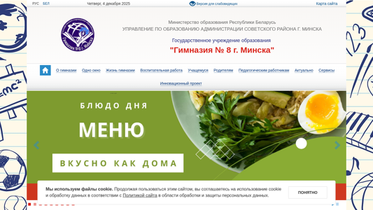 | AI-анализ | The web project "Гимназия № 8 г. Минска" (Minsk School No. 8) is a state educational institution located in Minsk, Belarus, operated under the Ministry of Education of the Republic of Belarus. The website provides information on the school's administration, faculty, normative documents, library, media center, public organizations, safety measures, and various activities. Users can find schedules for meetings with officials, telephonic Q&A sessions, and information on nearby institutions. The website also offers an electronic application system, accessibility settings, and a map of the site. Keywords: Minsk School No. 8, state educational institution, Ministry of Education, Belarus. |