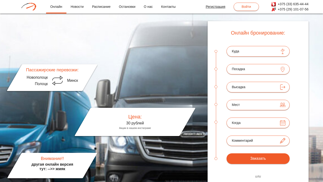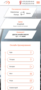 | AI-анализ | --- This website is for the online booking of passenger transportation between Novopolotsk, Polotsk, and Minsk, and vice versa. The site offers real-time information on schedules, stops, and fares, as well as the option to book or download a mobile application. Keywords associated with the site include 'marshrutka', 'novopolotsk', 'polotsk', 'minsk', and 'online booking'. The site features news, pricing information, and updates on rules and regulations. Passengers can make a reservation or download the app for real-time schedule information and booking. The site also offers USB charging ports for mobile devices on their microbuses. The first departure from Minsk is at 4:00 AM. There are over 15 daily departures. The journey duration is approximately 3 hours and 20 minutes to 4 hours, |