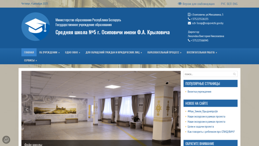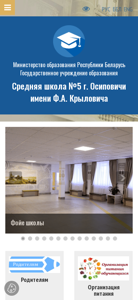 | AI-анализ | This website is for Middle School Number 5 in Osipopichi, named after F.A. Krylovich. The school is located at Michalikina Street, number 5 in Osipopichi. The director is Victoria Likhacheva and the phone number is +375223566945. The website provides information about the school, including its history, structure, leadership, goals, and work schedule. It also offers information about enrollment, contact information, and various educational programs. The school has a library, daycare facility, and various extracurricular activities. The website also includes links to periodic publications and useful resources for educators. Additionally, the website provides information on administrative procedures, normative legal acts, and contact information for addressing inquiries. The school follows a strict admission policy and has regulations for student behavior. The website is operated by the Ministry of |