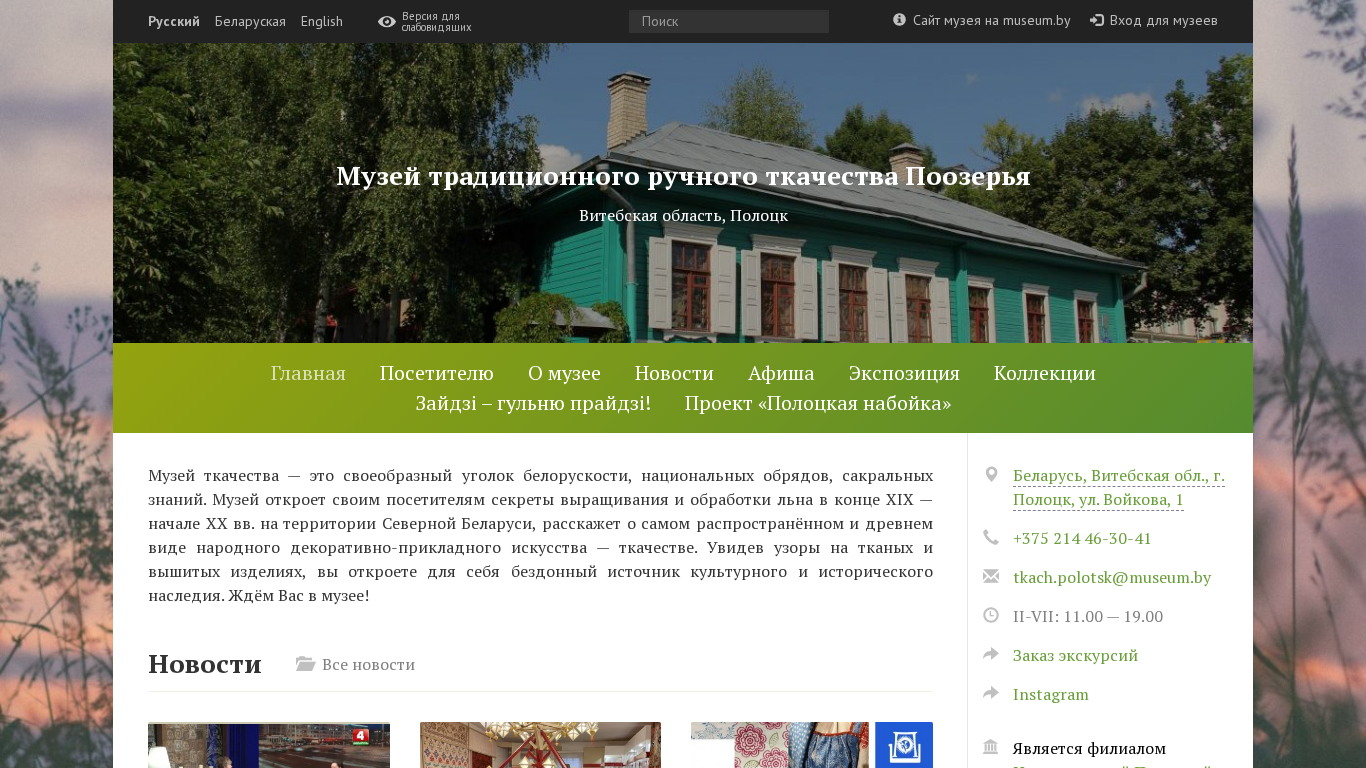| SEO-описание | Музей традиционного ручного ткачества Поозерья — новости и афиша мероприятий, информация для посетителей, цены, экспозиция, коллекции, материалы для музейщиков. |