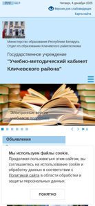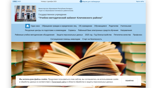 | AI-анализ | The website is the official website of the Klichevsky District Educational and Methodological Cabinet (rumk.klichev.edu.by). It is operated by the Klichevsky Regional Executive Committee's Department of Education in the Republic of Belarus. The website provides information about the cabinet, its administrative procedures, contacts for citizens and legal entities, and various educational initiatives and resources. Cookies are used on the site, and users agree to their use and data processing upon continued use. The website includes sections for the Ministry of Education, administrative procedures, contacts, popular requests, a telephone directory, and various educational materials and services. The site also features a virtual tour, a pedagogical staff directory, and links to important documents and resources. The website is designed for the 2025/2026 academic year and includes sections for class teachers, subject teachers, and a methodological collection. |