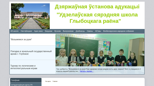 | AI-анализ | This website is for the 'Галоўная - Удзелаўская дзіцячы сад-сярэдняя школа' or 'Primary and Middle School Udelo' in the Glybokoy region of Belarus. The title and description suggest this is a school website. The most frequent words on the site include 'class', 'school', 'work', 'lesson', 'pupils', 'resource', and 'metadichny'. There is mention of a 'Principal's Cabinet', 'Consultations with a Social Pedagogue', and 'Social Partnership'. There are also sections for 'News', 'Parents', and 'Students'. The site contains information about classes from 1 to 11, and mentions examinations, certificates, and university invitations for students. There are also references to various events, such |