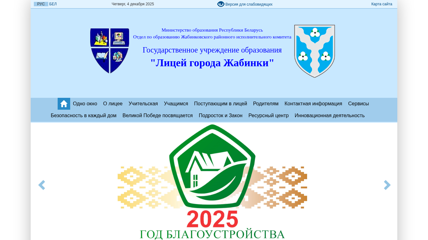 | AI-анализ | --- The web project "Лицей города Жабинки" (licey.zhabinka.edu.by) is an educational institution website in Belarus. The title is "Лицей города Жабинки" and the description includes keywords such as "правила", "поведения", "учебный год", and "образования". The top words are "профилактика", "при", "учащихся", and "лицей". The website has a standard color scheme and no images. It provides information on the Ministry of Education in Belarus, the administrative procedures, the schedule of the leadership, and contact details. The site includes sections for students, teachers, and parents, with resources such as a library, a newsletter, and a parent university. The website also offers anti-corruption commission information and information on academic |
