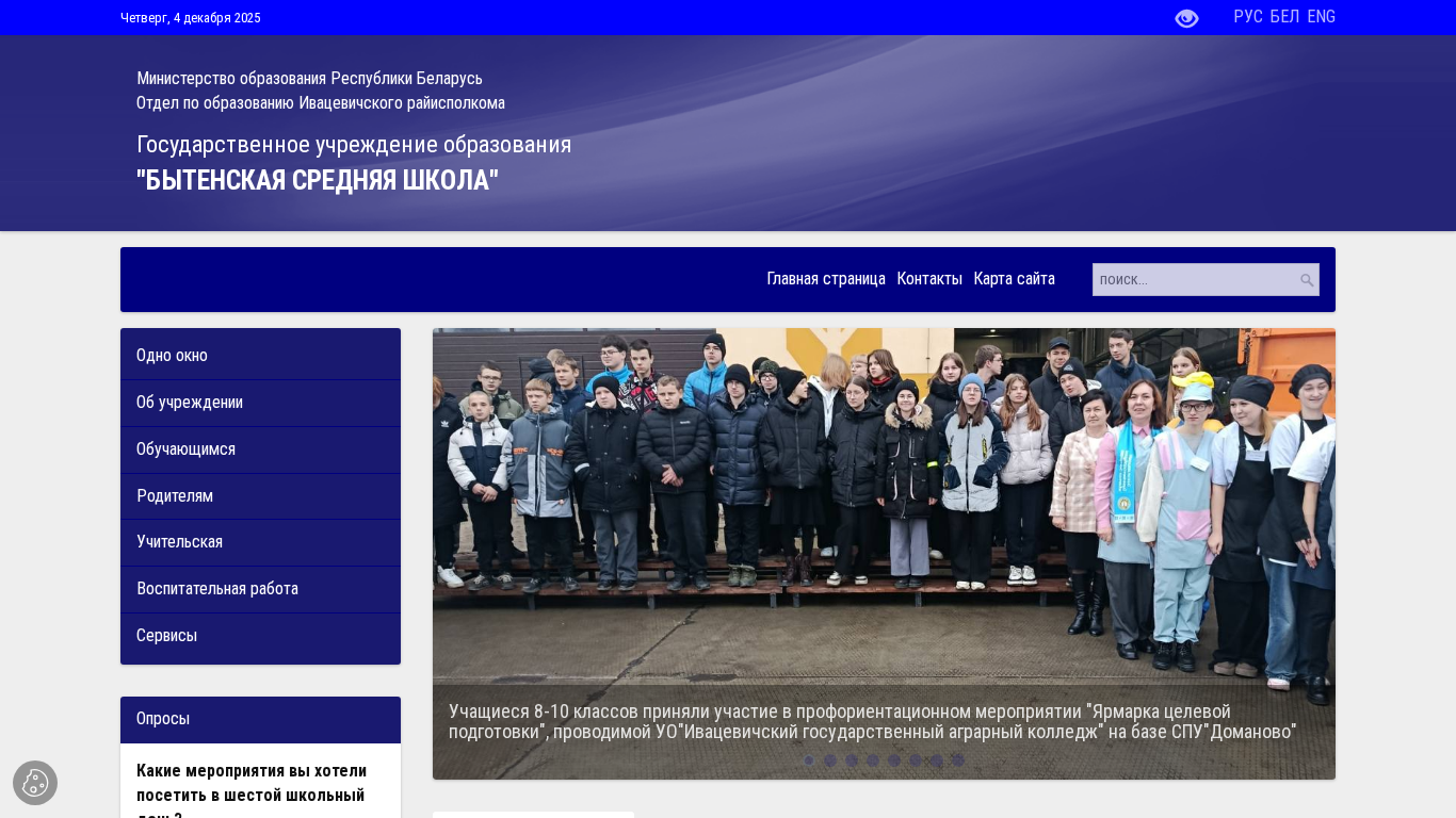 | AI-анализ | The web project "Бытенская Средняя Школа" (Bytenskaia Sredniaia Shkola) is the official website of a secondary school located in Ivacevichi, Belarus. The site provides information on the school's administration, contacts, schedules, educational programs, and rules. Keywords associated with the project include "школа" (school), "учащихся" (pupils), "график" (schedule), "библиотеки" (libraries), and "правила" (rules). The site includes sections on administrative procedures, citizens' rights, school leadership, contact information, and various forms and applications. Additionally, there are sections dedicated to the school library, its regulations, and work plans. The site also features an interactive school poster, information on IT certification, school history, and safety protocols. The domain is managed by |