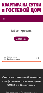 | AI-анализ | The website is a short-term accommodation service in the city of Osipovichi, Belarus. It offers both apartment rentals and a hotel-like guest house (DOM8) for daily stays. The accommodation options include VIP apartments and cozy rooms with private bathrooms and kitchenettes. Hot water is always available, and payment can be made with cards or cash. The Wi-Fi connection is fast at 100Mbps. The property features clean and comfortable living spaces, fresh linens, parking, a barbecue area, a lawn, and a pond. The contact information includes phone numbers for Viber, WhatsApp, Telegram, and the local landline. The website also provides information on room types, services, and prices, as well as the ability to book online by selecting arrival and departure dates. The website has received positive reviews, praising the modern renovation, interior design, |