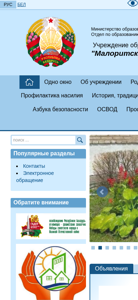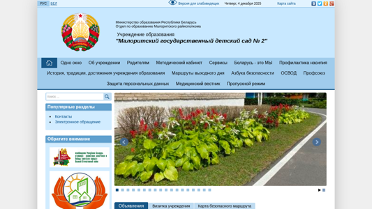 | AI-анализ | The portal "Ясли-сад №2 г.Малорита" is a Belarusian government educational institution website. It is dedicated to the "Малоритский государственный детский сад № 2" (Maloritsky State Kindergarten No. 2) in the city of Малорита. The site provides information on the kindergarten, its educational programs, methods, and services, as well as contacts and safety procedures. The homepage features a map and an RSS feed from the Ministry of Education of the Republic of Belarus. The site includes sections for parents, a methodical cabinet, services, and various announcements. It also offers an interactive map of the kindergarten, information on available spaces, and safety measures. The site is designed with a standard color scheme and font size, with a medium line spacing. Images are disabled, and the site |