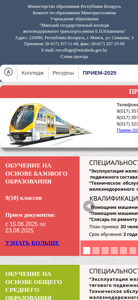| AI-анализ | This website belongs to the Miniski dzyarzhauny kalezh chyhunachnaga transportu imia Y.P. Yushkevich, a state educational institution under the Ministry of Education of the Republic of Belarus. The title is "Мінский дзяржаўны калеж чыгуначнага транспарту імя Я.П. Юшкевіча" (Minsk State College of Rail Transport named after Y.P. Yushkevich). The description includes information about the college's location in Minsk, its address on Semashko Street, and contact details, including a phone number, fax, and email address. The website offers resources for students, pedagogues, and parents, as well as information about the admission campaign, vacancies, experimental and innovative activities, methodological virtual cabinet, and |