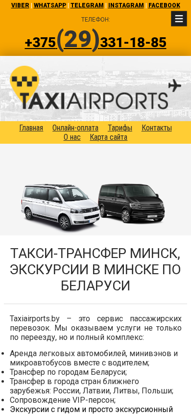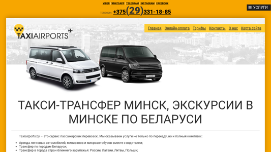| AI-анализ | --- The web project "Taxiairports.by" is an online taxi and transfer service based in Minsk, Belarus. It offers fixed-price passenger transport services throughout Belarus, including taxis and transfers in Minsk and other cities, VIP taxi services, and various other transportation solutions. The site also provides excursion services in Minsk and other Belarusian cities, as well as airport transfers. Users can contact the service via Viber, WhatsApp, Telegram, Instagram, Facebook, or by phone at +375 (29) 331-18-85. The site offers 24/7 service and various types of vehicles, including sedans, minivans, and microbuses, for rental with a driver. Services include transfers to/from various locations in Belarus and neighboring countries, as well |