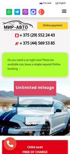 | AI-анализ | This online resource, titled "A cheap car hire in Minsk - Car rental Mir-Avto," provides information on car rental and hire in Minsk, Belarus. Visitors can choose from over 100 cars for rent with prices listed. The website offers both long-term car rental and car rental per day. Additional features include free mileage up to 300 km and a free child seat. Online booking is available for customer convenience. The website's address is provided, along with phone numbers for online payment. The catalog includes various car models from brands such as Audi, BMW, Chevrolet, Citroen, Dodge, Ford, Geely, Honda, Hyundai, Infiniti, Kia, Lexus, Mazda, Mercedes, Mitsubishi, Opel, Peugeot, Renault, Skoda, Toyota, Volksw |