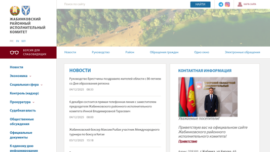 | AI-анализ | The web project "Zhabinka.brest-region.gov.by" is a local government portal for the Zhabinka district in Belarus. The website offers information on the administration of the district, including the contact details of various departments and their respective heads. The most frequent keywords used on the site are related to administrative procedures, the Belarusian republic, and the district's different rural councils (сельсоветы). The site includes sections on the history of the district, as well as a section for citizens to submit requests and inquiries. The site also provides a list of organizations that offer essential services to the population, along with their contact information. Additionally, the site includes a schedule for personal meetings with district administration officials, as well as information on how to contact them via telephone. The site is part of the larger "Brest-region.gov.by" network and provides |