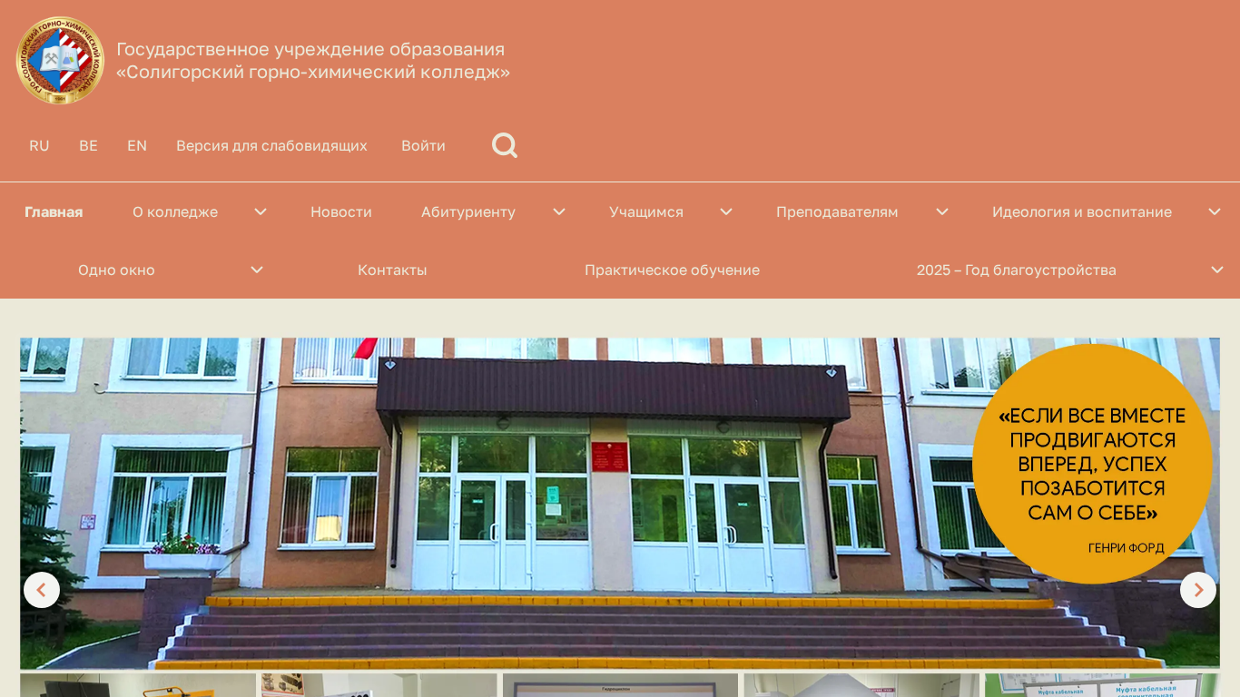 | AI-анализ | This online resource belongs to the State Educational Institution "Soligorsky Gorno-Khimichesky College" (Soligorsk Mining and Chemical College). The homepage features a main menu with sections on 'About the College', 'Administration', 'History', 'Structure', 'Virtual Excursion', 'Data Protection', 'Admissions', 'Specialties', 'Documents for Foreign Citizens', 'Dormitory', 'Perspectives of Employment', 'Professional Orientation', 'Centralized Testing', 'Students', 'Departments', 'Gorno', 'Electromechanical', 'Distance Learning', 'Specialties for Distance Learning', 'Educational Process Schedule', 'Methodical Guidelines', 'Textbooks and Methodological Complexes', 'Library', 'Events', 'Payment for Services through ERIP', ' |