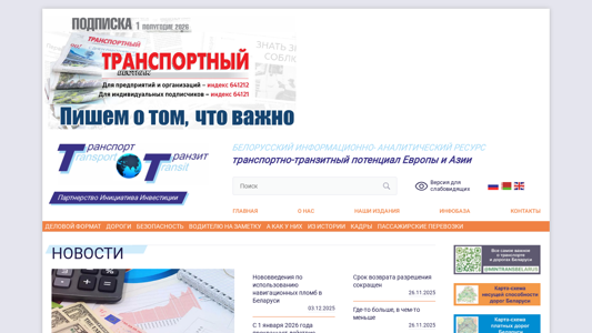 | AI-анализ | This website is a Belarusian informational-analytical resource focused on the transport-transit potential of Europe and Asia. It covers various topics related to transport and transit, including safety, routes, and regulatory changes. The site includes sections on news, passenger transportation, and a database for contacts. It also provides articles and information on the transportation sector in Belarus, such as new regulations for on-the-road calculations and the termination of a double taxation agreement with Lithuania. The site has a business format and is available in both Russian and Belarusian languages. |