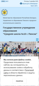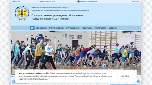 | AI-анализ | This website is for Middle School No. 10 in the city of Pinsk, Belarus. The title is "Средняя школа № 10 г.Пинска" (Middle School No. 10 of Pinsk). The description contains keywords such as "school," "classes," "schedule," "rules," "admissions," and "projects." The top words include "2025," "read," "further," "classes," "schedule," "year," "activities," "0165," "organization," "education," "site," "day," "rules," "admissions," "counsel," "umo," and "teachers." The website uses cookies and has settings for font size, line spacing, color scheme, and image display. It contains information about the Ministry of Education of Belarus, |