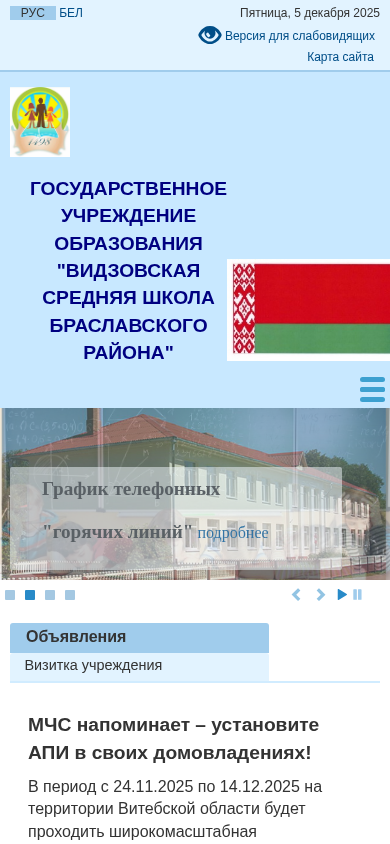 | AI-анализ | --- The web project "Видзовская СШ" (Vidzowskaya SS) is the official website for the State Educational Institution "Видзовская Средняя Школа Braslavskogo Rayona" (Vidzowskaya Srednyaya Shkola Braslavskogo Rayona) in Belarus. The website provides various administrative procedures, including information about the institution's leadership, a hall of fame, and data protection policies. It also features a schedule for academic and extracurricular activities, such as classes, bus routes, and optional activities. The site includes sections for students, parents, and staff, with resources for academic performance, mental health support, and school policies. Keywords associated with the website include "расписание" (schedule), "образования" (education), and "Беларусь" |