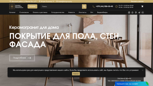 The website is an e-commerce platform selling ceramogranite in Belarus. The title of the website is "Купить керамогранит в Минске, плитка для дома в Беларуси" which translates to "Buy ceramogranite in Minsk, tile for home in Belarus". The description mentions "Заказать керамогранит в Беларуси недорого" which means "Order ceramogranite in Belarus cheaply". The website offers a wide range of ceramogranite products and provides delivery services to Minsk and all of Belarus. The website also includes a catalog, information about the company, payment and delivery, partnership opportunities, news, promotions, and contacts. The keywords include "керамогранит" (ceramogranite