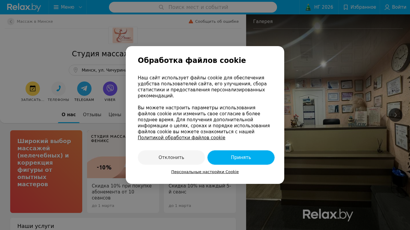 | SEO-описание | Студия массажа Феникс в Минске – отзывы, телефоны, график работы и карта проезда на Relax.by |