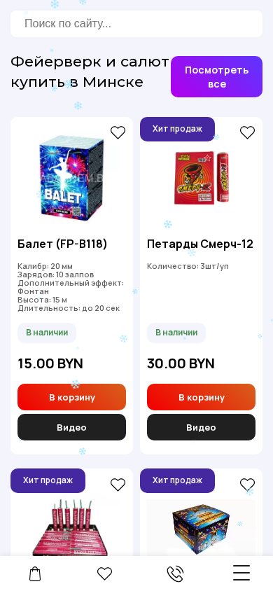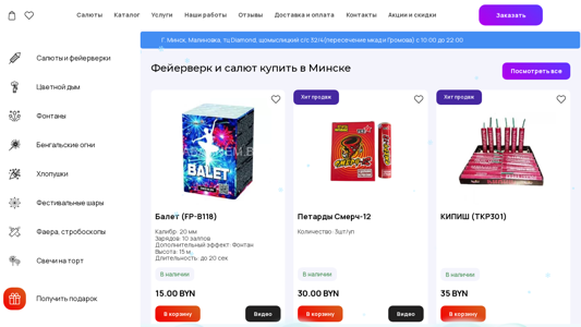 | AI-анализ | --- This online resource is an e-commerce platform selling fireworks and salutes in Minsk, Belarus. The website offers a wide selection of fireworks suitable for various celebrations and themes, with a frequently updated catalog and competitive prices. Customers can order fireworks and salutes at any time for quick delivery across the country. The website includes a catalog, information on services, customer reviews, delivery and payment options, and contacts, as well as ongoing promotions and discounts. Products listed include various sizes and types of fireworks, such as rockets, Roman candles, and fountains, as well as accessories like fireworks for cakes and novelty items. The website also includes product videos and customer testimonials. The contact information is provided for placing orders and inquiries. |