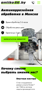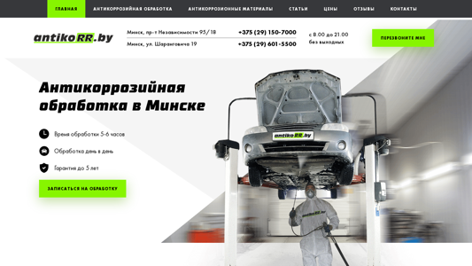 This website is an anticorrosion treatment service based in Minsk, Belarus, with the domain name Antikorr.by. The company, Dinitrol, offers anticorrosion treatment for cars and their bodies, including undercarriage, sills, and arches, as well as wheels and porches. The treatment process takes 5-6 hours and is available daily, with a 5-year guarantee. Customers can contact the company through two locations: Praspiekt Nezaleznasci 95/18 (+375 (29) 150-7000) and Ul. Sharanavich 19 (+375 (29) 601-5500), both open from 8:00 to 21:00 without weekends. The website also includes sections for prices