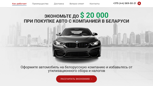 | AI-анализ | --- This online resource, titled "Главная" (Home), is a Belarusian website primarily focusing on the registration and purchase of vehicles from Belarus, the European Union, Russia, and the USA. Keywords associated with the website include 'companies', 'Belarus', 'registration', 'auto', and 'purchase'. The top words are 'companies', 'all', 'Russia', 'auto', and 'Belarus'. The website offers the advantage of avoiding utility fees and taxes by registering a vehicle under a Belarusian company, and the cost of annual company servicing is only $1,200. Users can select a vehicle in Belarus, Europe, the USA, or Korea, make a pre-payment of $2,000, and have the vehicle registered to their company. The website also includes a FAQ section and contact information |