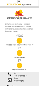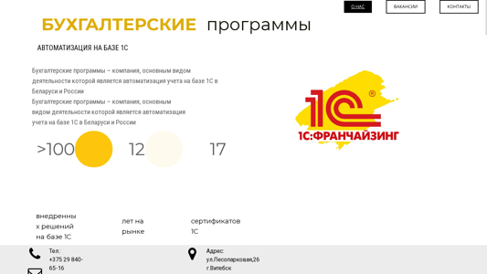 | AI-анализ | This website is a company called Бухгалтерские программы, based in Витебск, Республика Беларусь, that specializes in automating bookkeeping using 1С software in Belarus and Russia. The company has over 100 implemented solutions based on 1С and has been active on the market for over 12 years. They hold 17 certificates from 1С for their in-house developed solutions. The website provides contact information, including a phone number and email address, as well as an address in Витебск. The website also mentions vacancies and the company name repeatedly. |