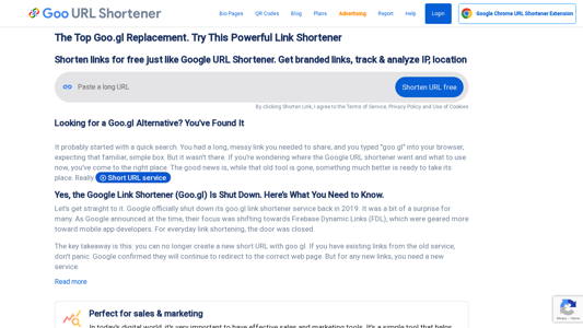 | AI-анализ | language: en This online resource is a free URL shortener service aimed at providing users with a simple and effective alternative to the discontinued Google URL shortener (Goo.gl). The website offers advanced analytics and custom URL options, allowing users to shorten their links and track important statistics such as clicks, IP addresses, and locations. The service is accessible via a website and a Google Chrome extension. Users can create branded links, customize the short URLs, and take advantage of error handling and redirection features. The website also includes a blog, plans for advertising, and a help section, providing additional resources and information for users. |