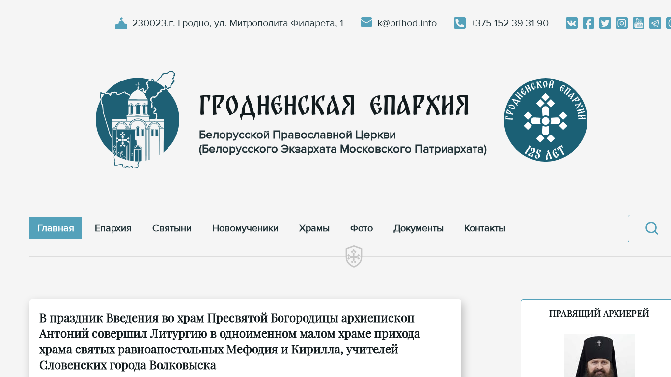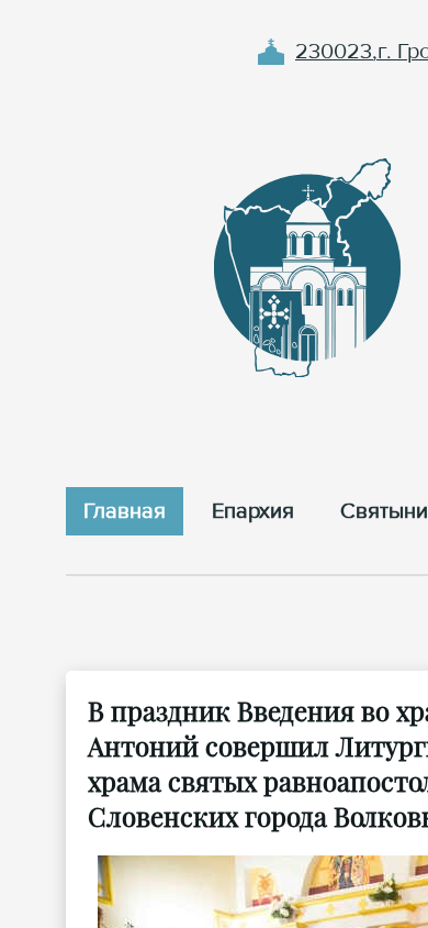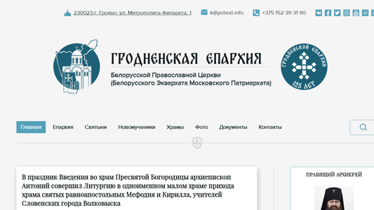 | AI-анализ | This website is the official page for the Grodno Eparchy of the Belarusian Orthodox Church (Belarusian Exarchate of the Moscow Patriarchate). Based in the city of Grodno, the eparchy covers the western part of the Grodno region, including territories of Grodненsky, Brestovitsky, Volkovyskoy, Zelyonsky, Mostovsky, Svislachsky, and Щucynsky districts, as well as parts of Voronovsky district. The website provides news and information about the eparchy, including photos and documents, as well as contacts for various parishes and clergy. Recent news includes the celebration of the Feast of the Presentation of the Most Holy Theotokos in the Church of Saints Mephodius and Cyril in Volkovysk on December 4, 2025. |