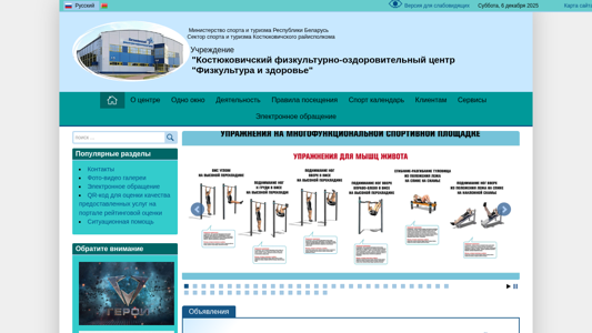| AI-анализ | --- The website "Костюковичский ФОЦ "Физкультура и здоровье" (foc.kostjukovichi.edu.by) is dedicated to the sports and wellness center of the same name in the Kostyukovichy region of Belarus. The site's title translates to "Kostyukovichy District Physical Culture and Health Center." The description includes keywords related to sports, fitness, health, and the center itself. The top words suggest sections for news, rules for visiting, a sports calendar, services, electronic inquiries, popular topics, and contacts. The site also features a poll for visitors regarding the need for a children's play area and a daycare service at the center. The content is presented in Russian, and there are options for a standard or large font size and standard or increased line spacing. The |