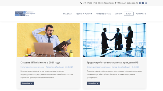 | AI-анализ | --- The website is a blog named "Блог Бел Учет - Бухгалтерия простыми словами" (Blog Bel Uchet - Buchgalteria Prostymi Slovami), run by Bel Uchet, a Belarusian accounting services company. The blog provides information about various accounting services and related topics, with articles written by Elena Razbitckaya. The website includes sections for the main page, prices and services, reviews, a blog, and contacts. The contact information for Bel Uchet is provided, including a phone number and email address, as well as a physical address in Minsk. The blog covers topics such as starting a business as an individual entrepreneur, hiring foreign citizens, tax calculations, and the tax system for individual entrepreneurs in Belarus. The website is written in Belarusian and Russian languages. |