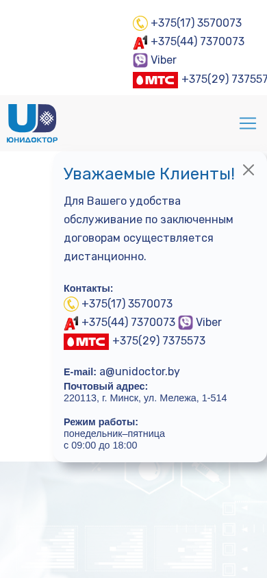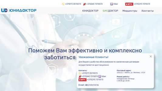 | AI-анализ | This online resource is titled "UNIDOCTOR" and offers various medical services, including consultative-diagnostic examinations by doctors, laboratory and instrumental investigations, minor operative and diagnostic interventions, and medical manipulations. Distinctive features of the service include distant consultations with a psychologist, which are included in the contract as an addition to medical services. These consultations contribute to a more comprehensive approach to health care, as chronic stress can lead to physical illnesses. Clients can contact UNIDOCTOR via telephone in Minsk (+375(17) 3570073), mobile phones (A1: +375(44) 7370073, MTS: +375(29) 7375573), Viber, or email (a@unidoctor.by). The medical center's |