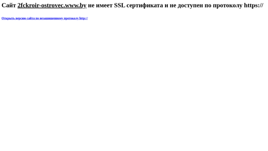This website, 2fckroir-ostrovec.www.by, does not have an SSL certificate and is not accessible via the secure https:// protocol. It can only be opened using the unsecured http:// protocol. The title and description of the website are unknown. The keywords associated with this domain include "protocol," "site," "2fckroir-ostrovec," "www," "has," "ssl," "certificate," "available," "https," "open," "version," "site," and "unprotected." The top words for this domain are "протоколу" (protocol) and "сайт" (site), each appearing twice.