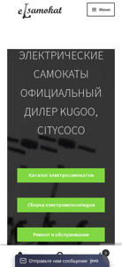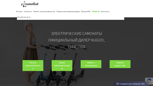 | AI-анализ | --- The portal Elsamokat is an online shop for electric scooters located in Minsk, Belarus. The website invites visitors to choose and order an electric scooter at attractive prices with delivery across Belarus. The phone number for inquiries is +375 (29)121-25-12. The site offers a catalog of electric scooters for sale, including models from Kugoo and Citycoco, with options for assembly, repair, and battery replacement. Visitors can place orders for various electric scooter models such as Kugoo S1, Kugoo S3, Kugoo M2, Kugoo M2 PRO, Kugoo HX, Kugoo M4, Kugoo Max Speed, Kugoo HX PRO, Kugoo V1, Kugoo C1 Plus, Kugoo ES |