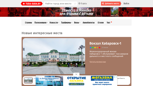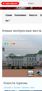 | AI-анализ | The website tuda-suda.by functions as a tourist portal, offering a vast collection of interesting locations worldwide. Users can explore selected destinations and embark on virtual journeys immediately. The portal includes sections on countries, border crossings, schedules, tour companies, visas, and airline tickets. News on tourism in Belarus, Russia, Ukraine, and the rest of the world are also featured. The website's top keywords are 'tourist portal,' 'guide,' 'travel,' 'tourism,' and 'reference to countries.' The homepage includes links to popular tourist destinations such as the International Airport of Habarovsk, Habarovsk Autobus Station, and the Rocket River Cruise Terminal. News articles cover topics like the opening of a new elite alcohol factory in Belarus, new airline routes connecting Russia and Belarus, and upcoming events |