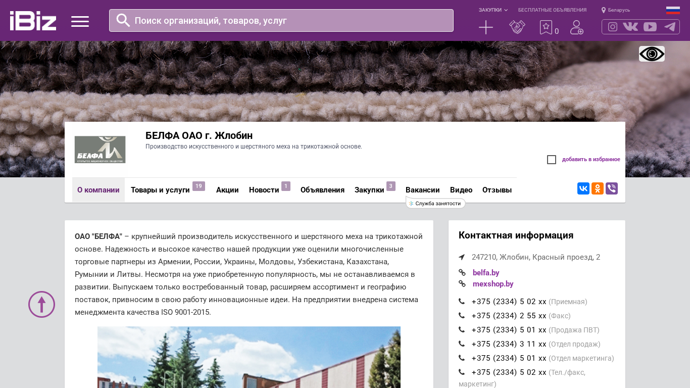 SEO-описаниеБЕЛФА ОАО г. Жлобин - Производство искусственного и шерстяного меха на трикотажной основе.. Схема проезда, контактные телефоны, адрес компании БЕЛФА ОАО г. Жлобин. 247210, Жлобин, , Красный проезд, 2