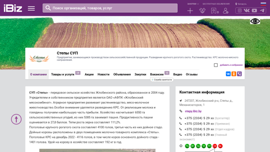 | AI-анализ | <-- fragment The website is for a Belarusian agricultural enterprise named Степы СУП. It specializes in the production of agricultural products, focusing on cattle farming and agriculture. The business engages in both milk-meat production of cattle and crop farming. The contact details, address, and schematic directions for the company Степы СУП are provided, along with the location in Belarus, region, street, and house number. Keywords associated with the website include 'production', 'cultivation', 'livestock', 'milk', 'meat', 'crops', and 'seeds'. |
