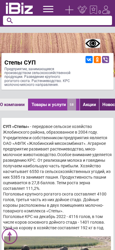| Название / Заголовок | Степы СУП - Предприятие, занимающееся производством сельскохозяйственной продукции. Разведение крупного рогатого скота. Растениеводство. КРС молочно-мясного направления.. 247207, , Степы д., Механизаторов, 1 |