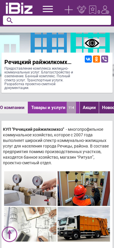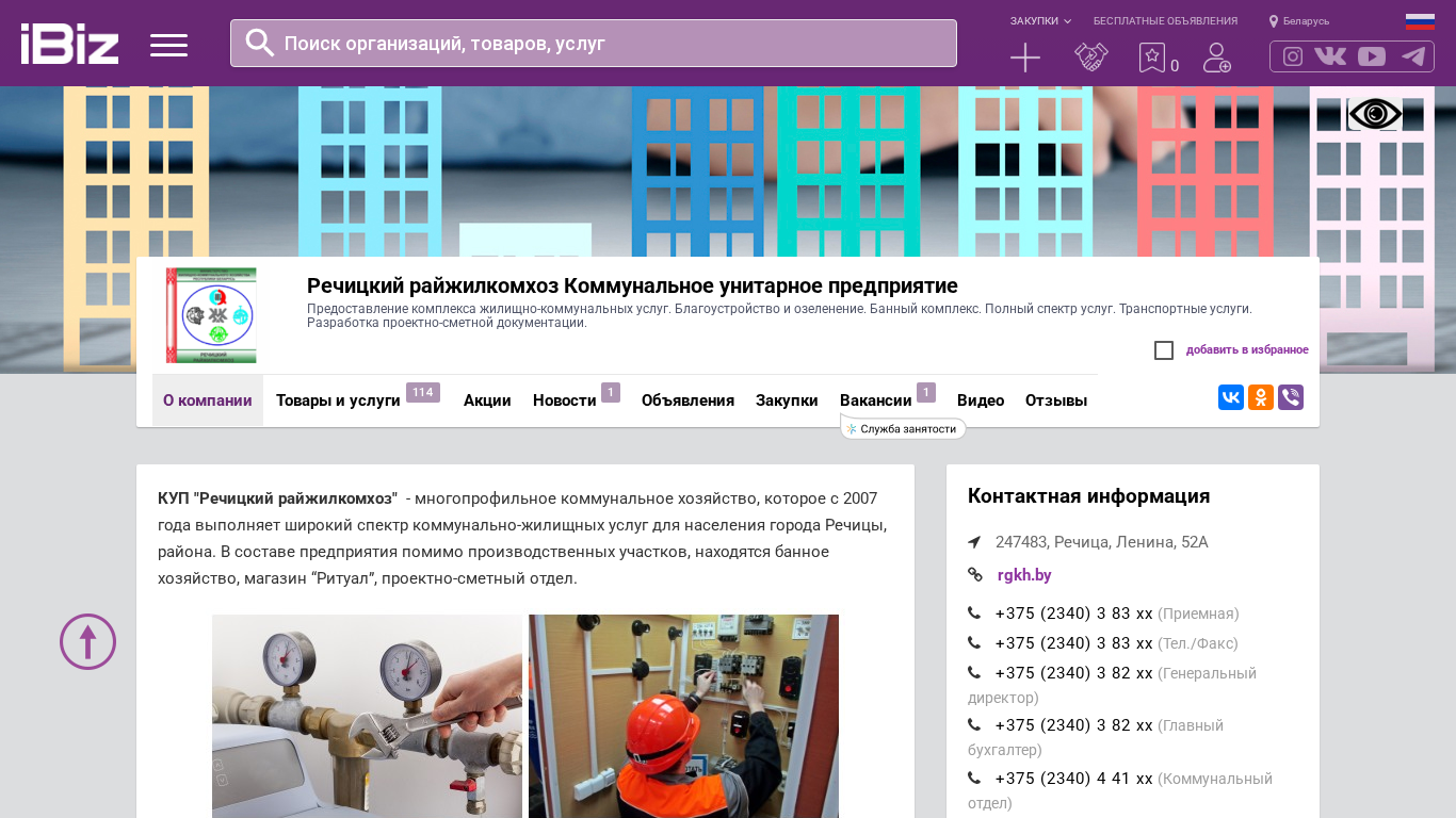 | AI-анализ | The website "RGKH.IBIZ.BY" is a multi-profile communal enterprise that has been providing a wide range of communal-housing services to the population of Rechitsa city and district since 2007. The enterprise includes production units, a bathing complex, a "Ritual" store, and a project-estimate department. The enterprise offers both free and paid services: communal services; transport services; services from the project-estimate department; water supply; heat supply; construction and installation works; services from the bathing complex; waste removal and processing; repair and construction works; and technical and sanitary servicing of courtyard territories, streets and more. The communal enterprise also offers ritual services and goods. It produces metal crosses, graves, metal gates, benches, cushions, bedspreads, runners, wreaths, v |