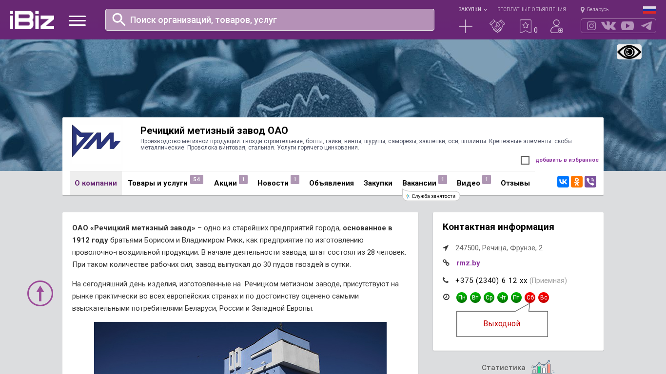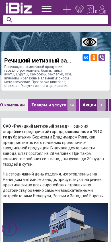 | AI-анализ | <!--- END fragment ---> The portal "Речицкий метизный завод ОАО" is a manufacturing company producing various bolts, nuts, screws, fasteners, osy, spindles, and wire rods. The company offers hot-dip galvanizing services. The company was founded in 1912 by brothers Boris and Vladimir Ricke as a production facility for wire-nailed products. Initially, the workforce consisted of 28 people, producing 30 pounds of nails per day. Today, the products manufactured at the Rechiцкий метизный завод are present in the markets of almost all European countries and highly valued by discerning consumers in Belarus, Russia, and Western Europe. The primary business of the company is the production of various types of fasteners, including building nails, machine screws, special |