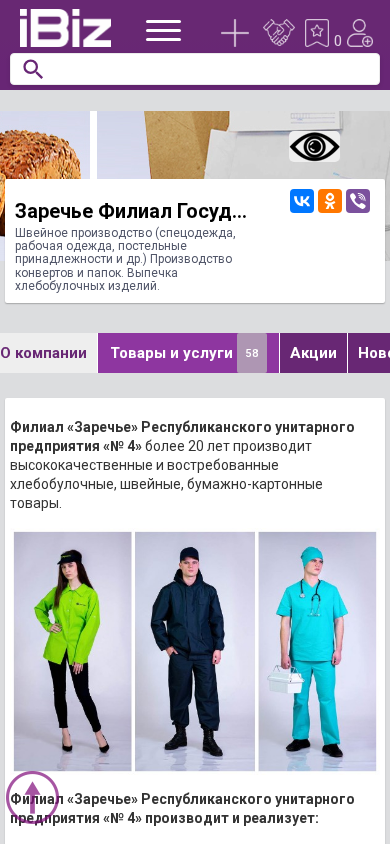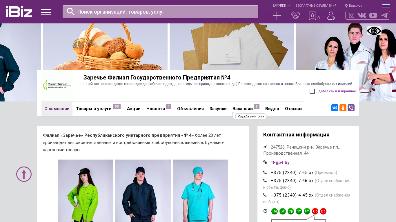 | Название / Заголовок | Заречье Филиал Государственного Предприятия №4 - Швейное производство (спецодежда, рабочая одежда, постельные принадлежности и др.) Производство конвертов и папок. Выпечка хлебобулочных изделий.. 247526, , Заречье г.п., Производственная, 44 |