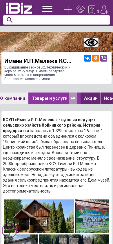 | Название / Заголовок | Имени И.П.Мележа КСУП - Выращивание зерновых, технических и кормовых культур. Животноводство мясо-молочного направления. Реализация молока и мяса.. 247607, , Глинище д., Советская, 11 |
