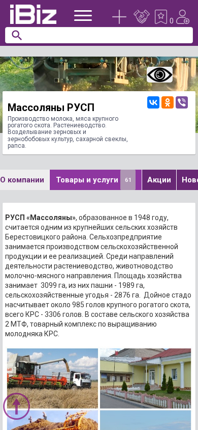| Название / Заголовок | Массоляны РУСП - Производство молока, мяса крупного рогатого скота. Растениеводство. Возделывание зерновых и зернобобовых культур, сахарной свеклы, рапса.. 231788, , Массоляны аг., Центральная, 12 |