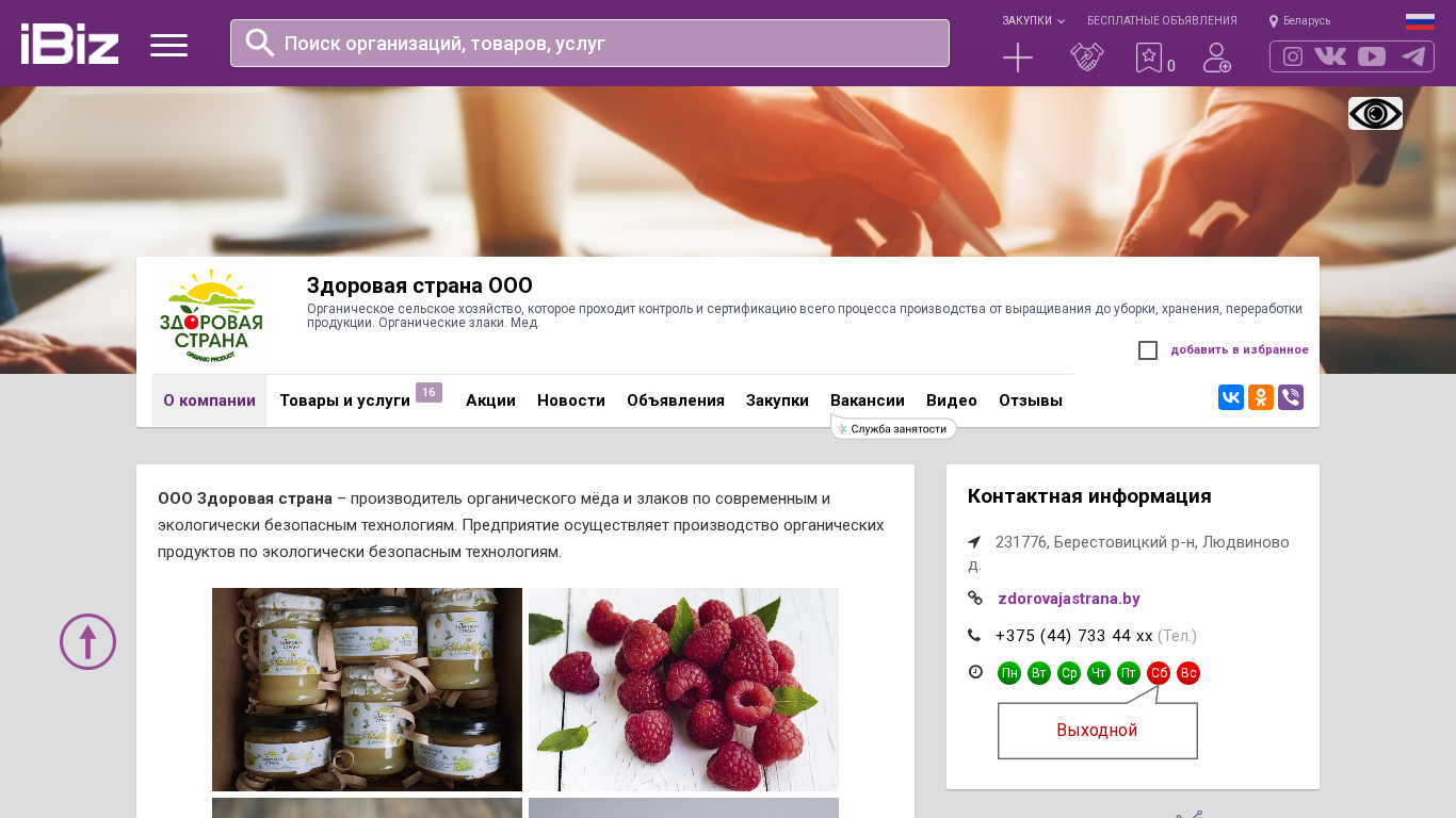 | Название / Заголовок | Здоровая страна ООО - Органическое сельское хозяйство, которое проходит контроль и сертификацию всего процесса производства от выращивания до уборки, хранения, переработки продукции. Органические злаки. Мед.. 231776, , Людвиново д. |