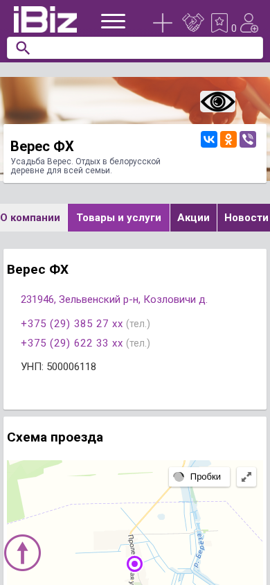 | AI-анализ | The portal Fh-veres.ibiz.by is a Belarusian farmhouse and recreation complex named 'Verez FH - Usadba Verez' offering family vacations in a rural Belarusian setting. The website provides a map, contact numbers, and the address of the company Verez FH. It features sections for company information, goods and services, agricultural enterprises and farmer households, announcements, and vacancies. The company is located in Zhelvensky district, in the village of Koslovichi. The website operates from 09:00 to 18:00, Monday through Friday, with weekends being days off. The contact details include the phone numbers +375 (29) 385 27 xx and +375 (29) 622 33 xx. The company is listed |