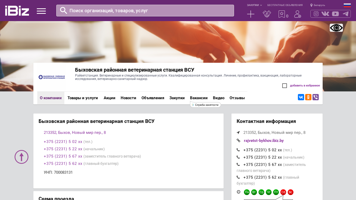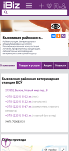 | AI-анализ | This online resource is a website for the Bykhov Regional Veterinary Station VSU (Rajvetstania) located in Bykhov, Belarus. The website provides information on veterinary and specialized services, offering qualified consultation, treatment, prevention, vaccination, laboratory investigations, and veterinary sanitary oversight. The address and contact numbers for the station are also provided. |