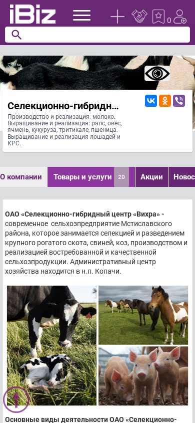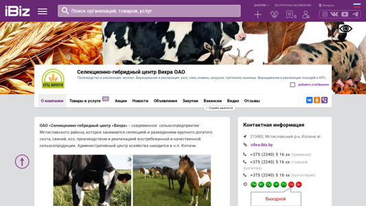 | AI-анализ | The web project is a modern agricultural enterprise named Селекционно-гибридный центр Вихра ОАО, located in Mstislavsky district, Belarus. The company focuses on cattle breeding, pig farming, goat farming, and production and sale of popular and high-quality agricultural products including raps, oats, barley, corn, triticale, and wheat. The administrative center of the enterprise is in the village of Copachi. The main activities of OAO «Селекционно-гибридный центр «Вихра» include crop cultivation and sales, livestock farming, pig farming, goat farming, grain production, organic fertilizer sales, and agricultural product sales. The center provides services such as grain milling, tractor services, MAZ automobile services, artificial insemination, goat shearing, and combine har |