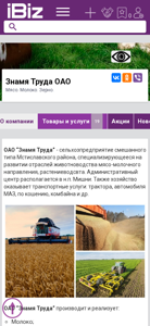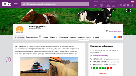 | AI-анализ | --- The web project "Znamya Truda OAO - Мясо. Молоко. Зерно.." is a Belarusian agricultural company specializing in the development of livestock and milk production, as well as farming. The administrative center of the company is located in the settlement of Mishni. In addition to agricultural activities, the company offers transportation services including tractors, MAZ trucks, milking, and combine harvesters. The company produces and sells milk, beef, grain, livestock feed, hay, and organic fertilizers. The primary source of income for the company is the sale of milk and beef. Livestock are kept on livestock and dairy farms equipped with modern equipment. The farming sector is not only involved in growing crops for commercial use but also produces fodder for the livestock industry. The company invites potential partners for mut |